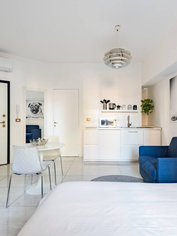 L’appartamento è composto da un soggiorno open-space con un romantico caminetto, Smart Tv 55" (NETFLIX), cucina completamente attrezzata (doppia piastra a induzione, frigorifero, lavastoviglie, bollitore, forno a microonde), un letto matrimoniale Fluo (160x200) e bagno con doccia in camera. Completa l’arredo una comodissima poltrona letto. Il fast Wi-Fi è interamente gratuito.
