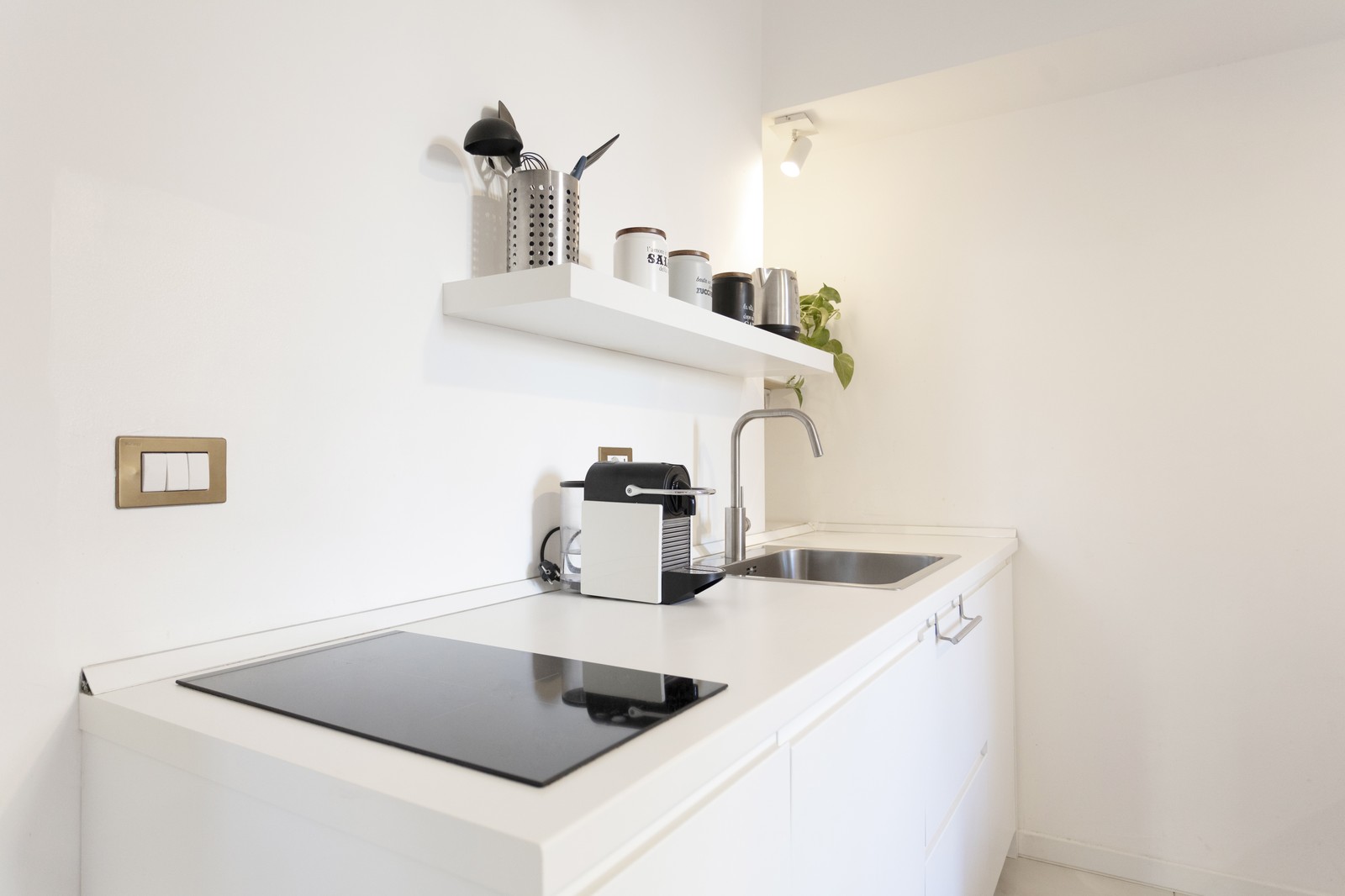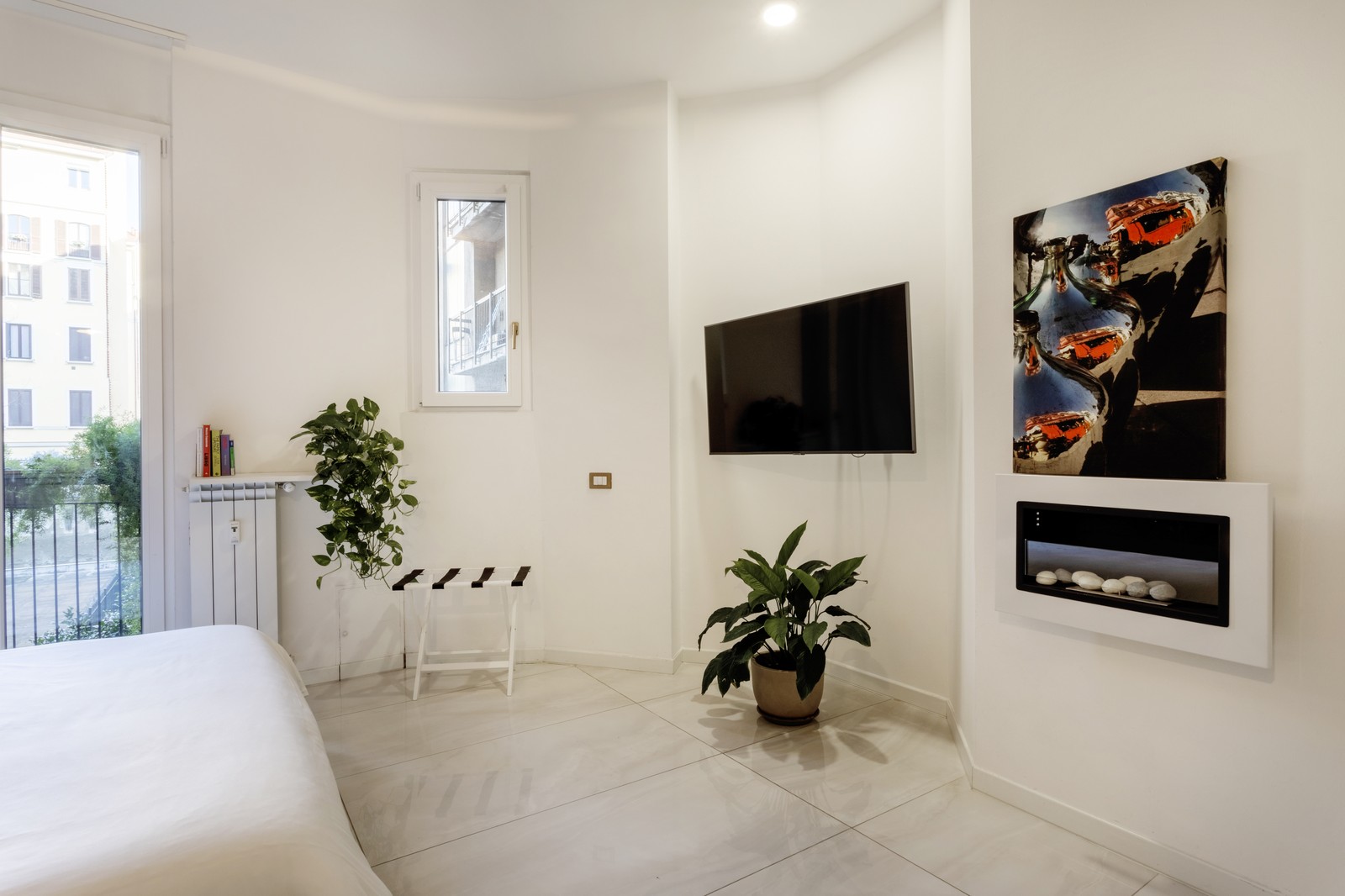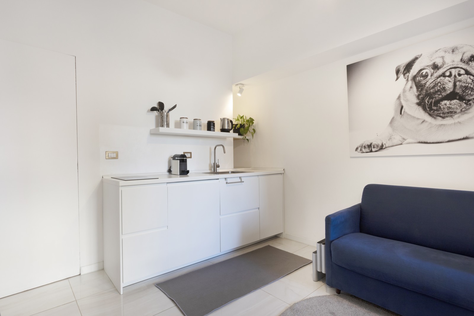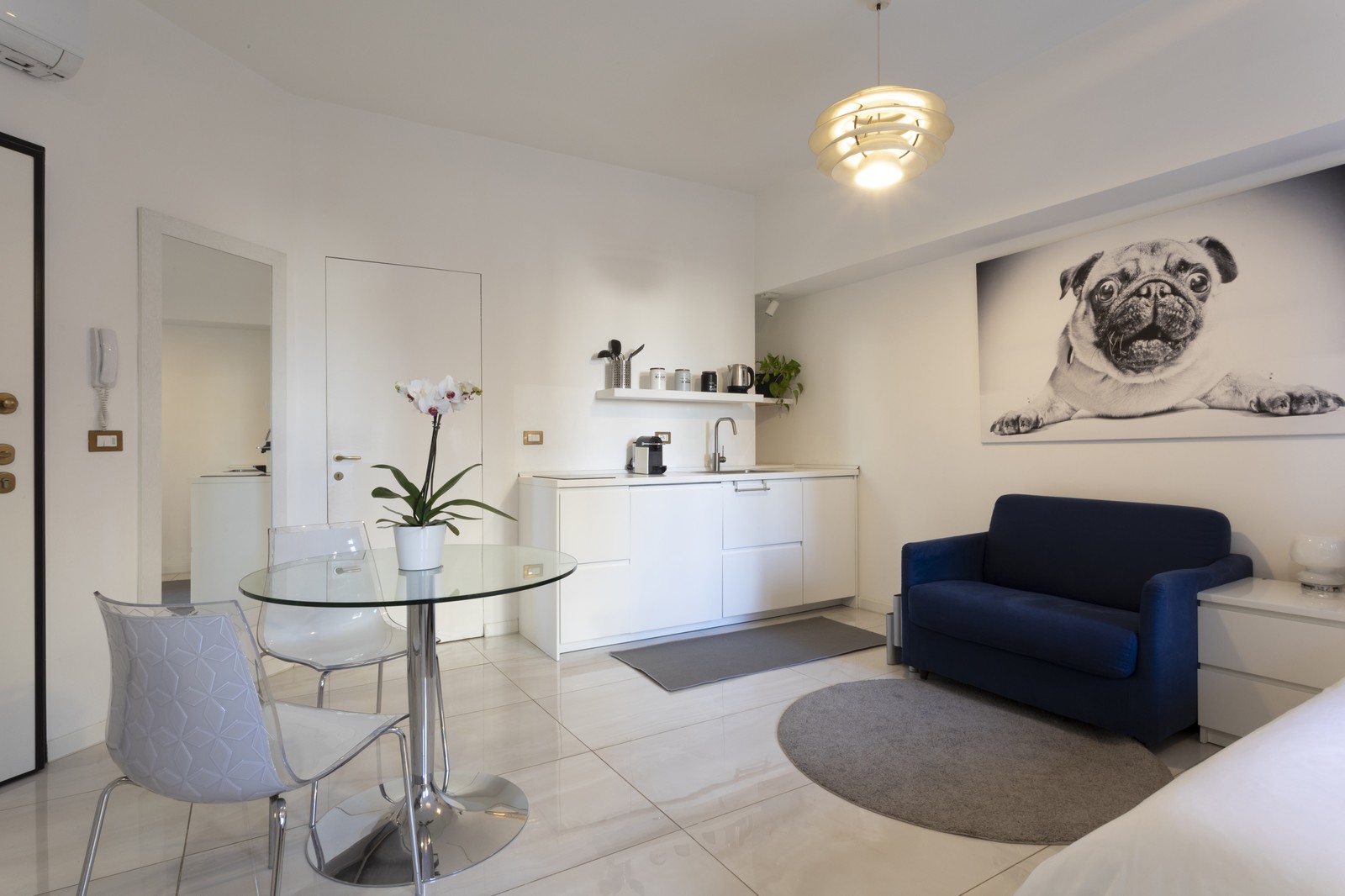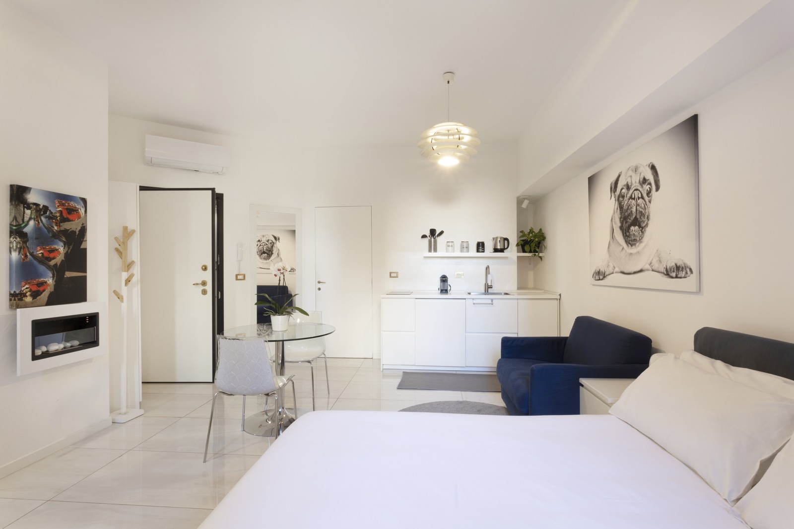 L’appartamento è composto da un soggiorno open-space con un romantico caminetto, Smart Tv 55" (NETFLIX), cucina completamente attrezzata (doppia piastra a induzione, frigorifero, lavastoviglie, bollitore, forno a microonde), un letto matrimoniale Fluo (160x200) e bagno con doccia in camera.