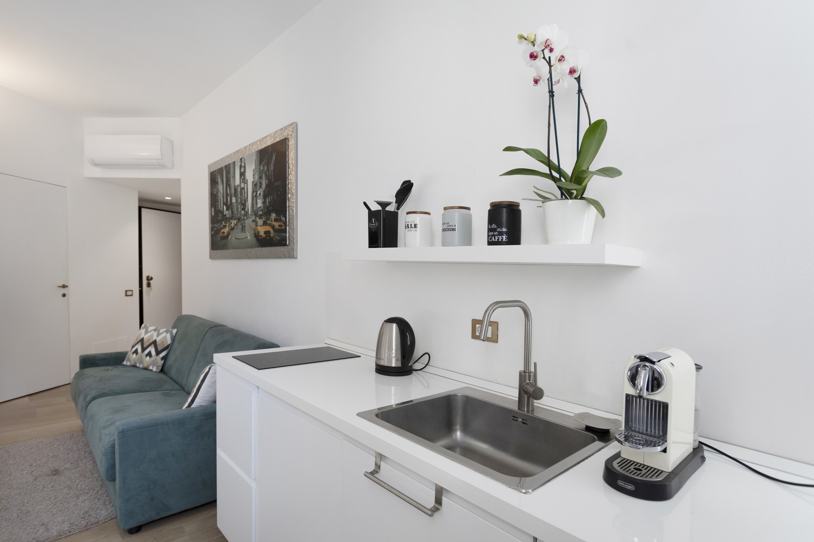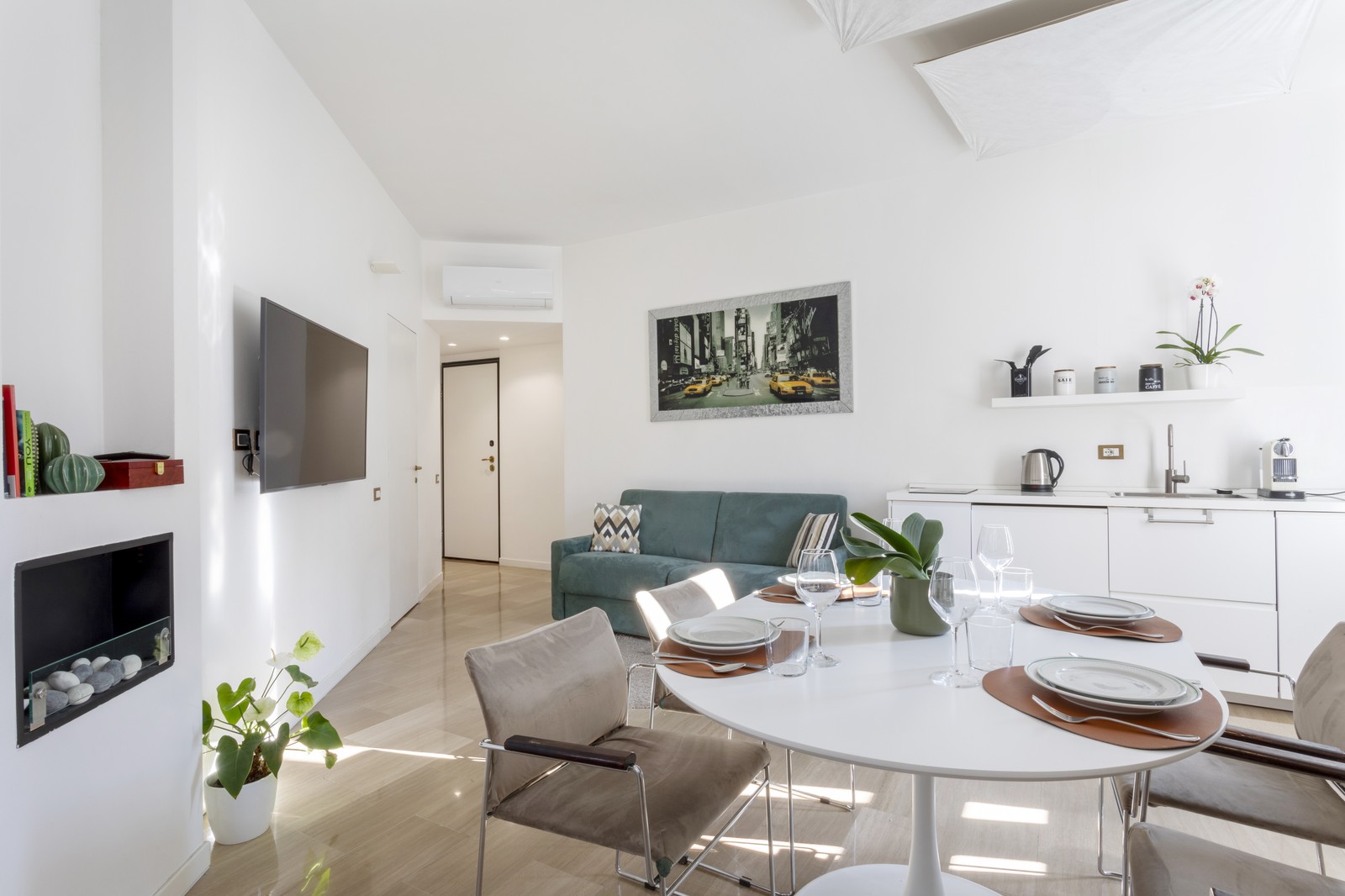 L’appartamento è composto da un soggiorno open-space con un romantico caminetto, Smart Tv 55" (NETFLIX), cucina completamente attrezzata (doppia piastra a induzione, frigorifero, lavastoviglie, bollitore, forno a microonde), un letto matrimoniale Fluo (160x200) e bagno con doccia in camera.